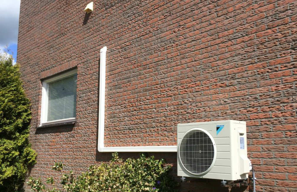 Bijzonderheden:Leidingen uit het zicht weggewerkt in een kunststof gootsysteem en RVS wandconsoles t.b.v. de buitenunit opgesteld aan de gevel.