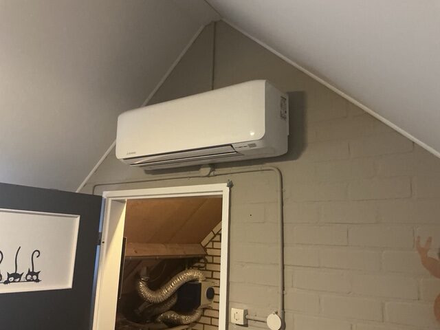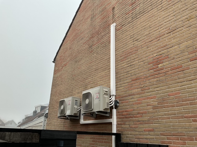 Bijzonderheden: leidingen netjes weggewerkt in een kunststof gootsysteem op de buitengevel, trapkast en zolderkast. De buitenunits gemonteerd op RVS beugels gepoedercoat met trillingsdempers.